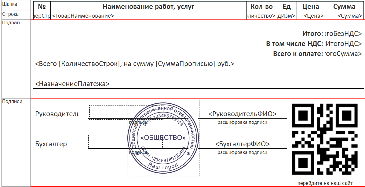 - Подписи - эта область с подписями и печатью организации. Она также должна быть проверена вместе с областью “Подвал”, помещается ли она с последней строкой на странице.
